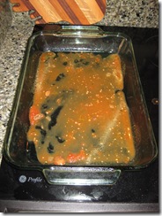 When you’ve got the slices grilled, bring them inside. Spray the bottom of a good sized baking pan with nonstick spray, then spread a little bit of sauce across the bottom of the pan.